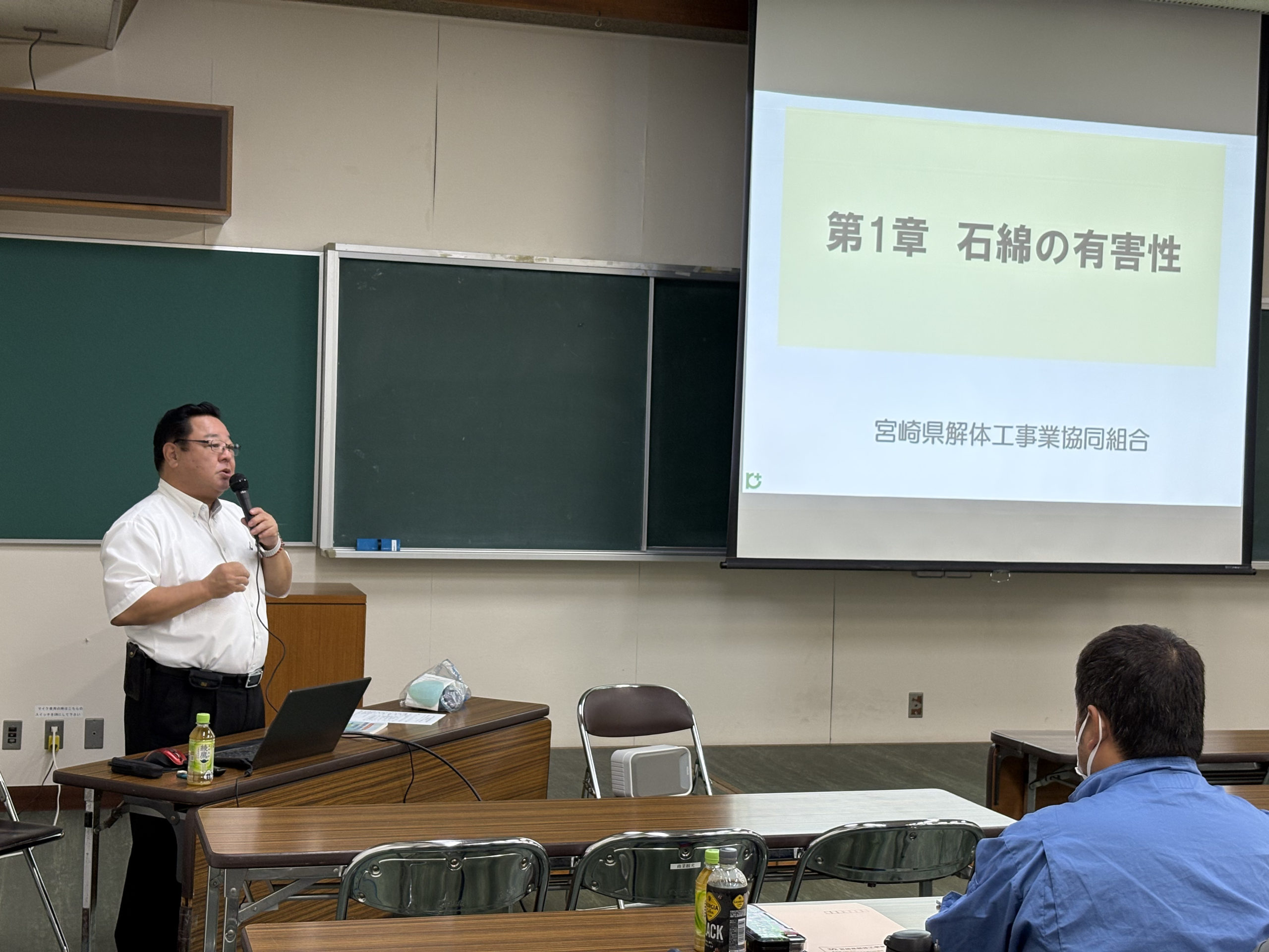 9/24㈬に延岡電気工事業協同組合からの依頼を受けて、延岡市中小企業振興センターにて石綿取扱作業従事者特別教育を開催しました。