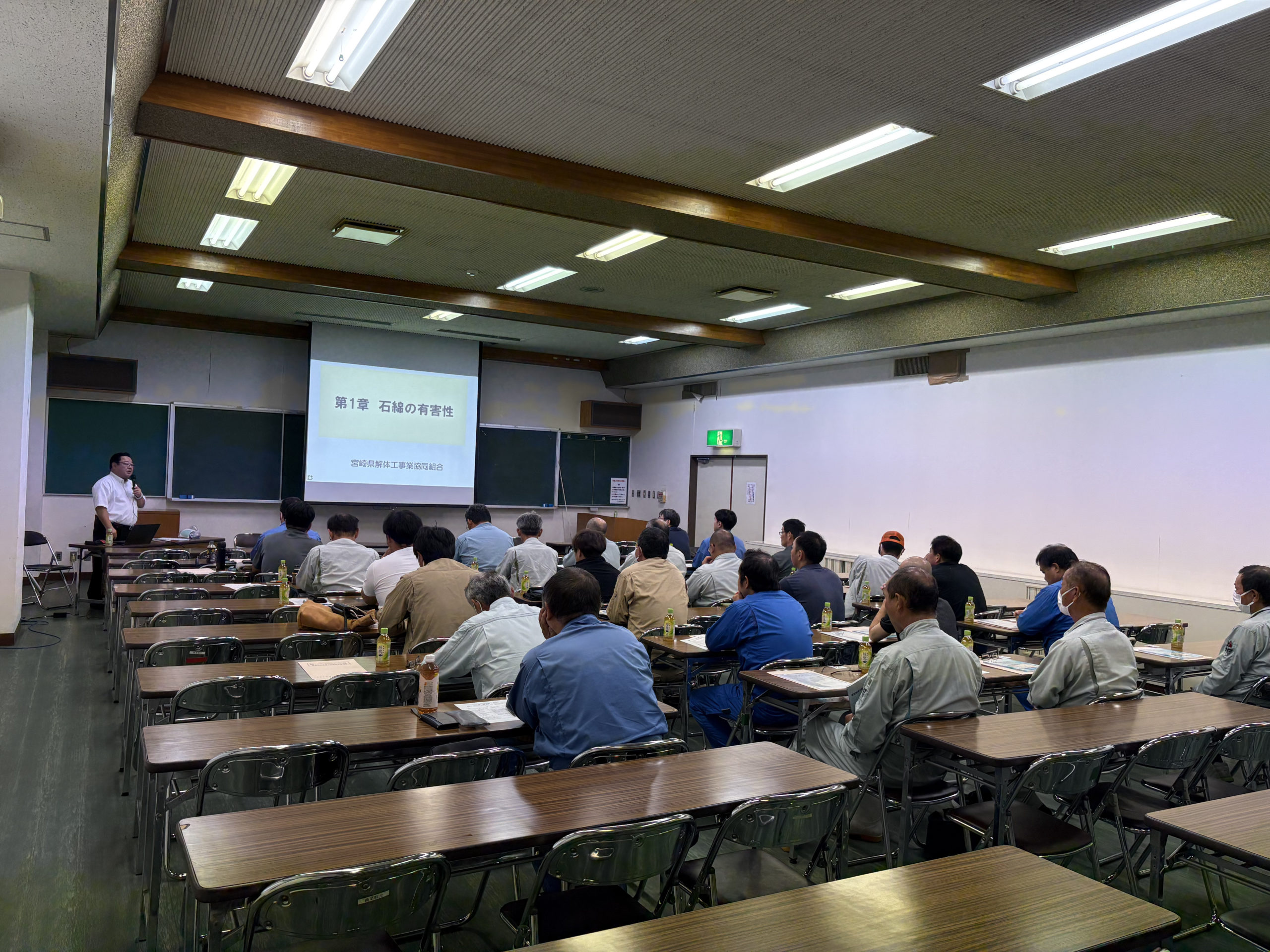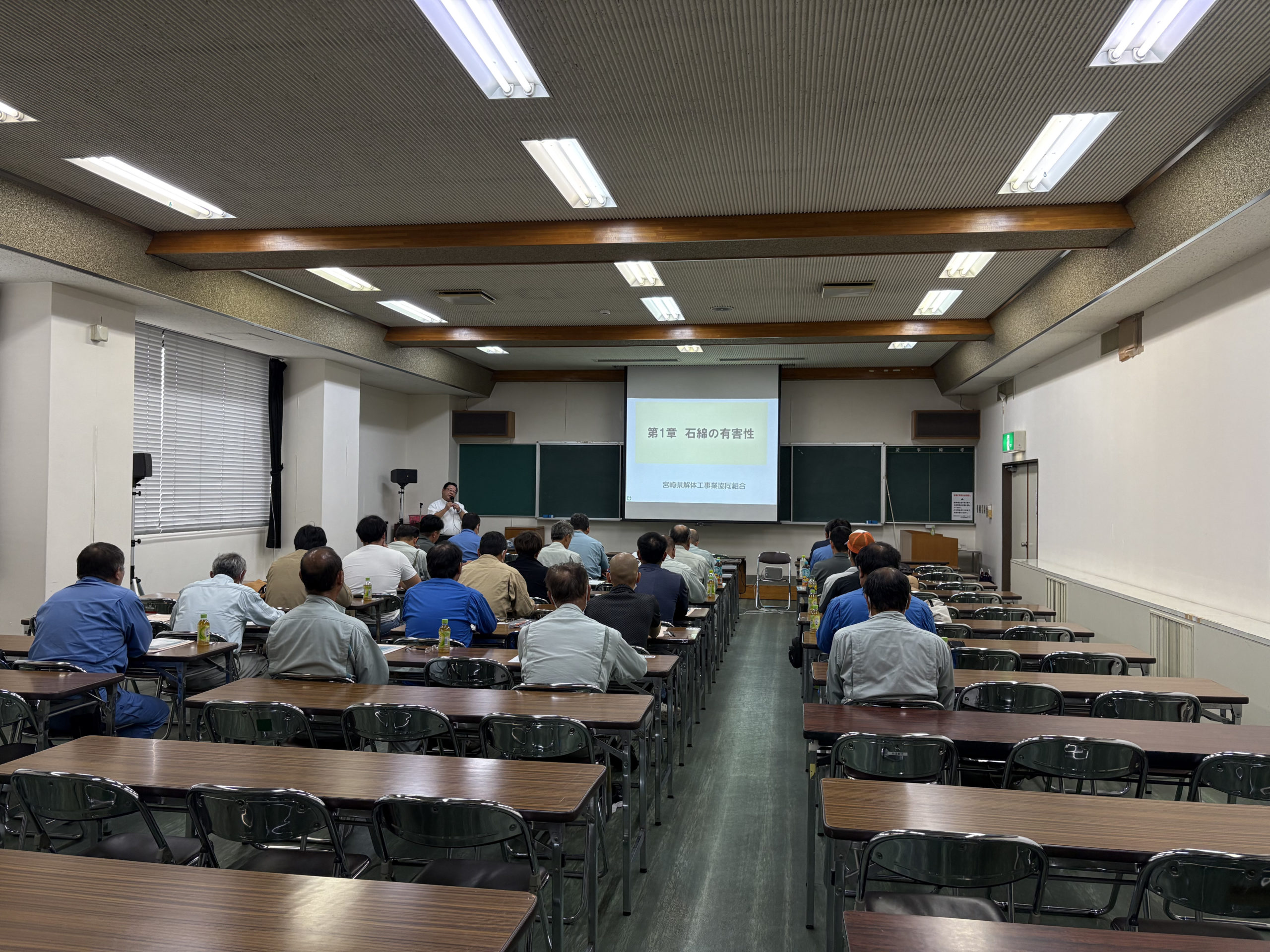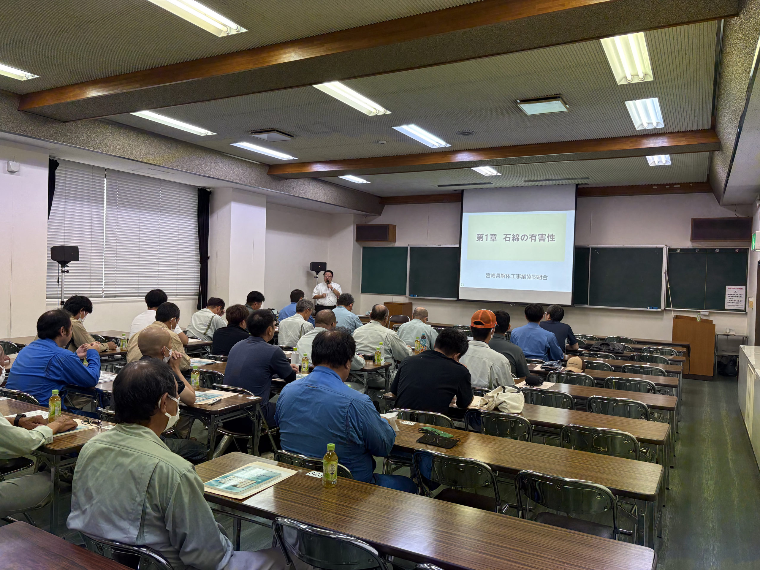 9/24㈬に延岡電気工事業協同組合からの依頼を受けて、延岡市中小企業振興センターにて石綿取扱作業従事者特別教育を開催しました。